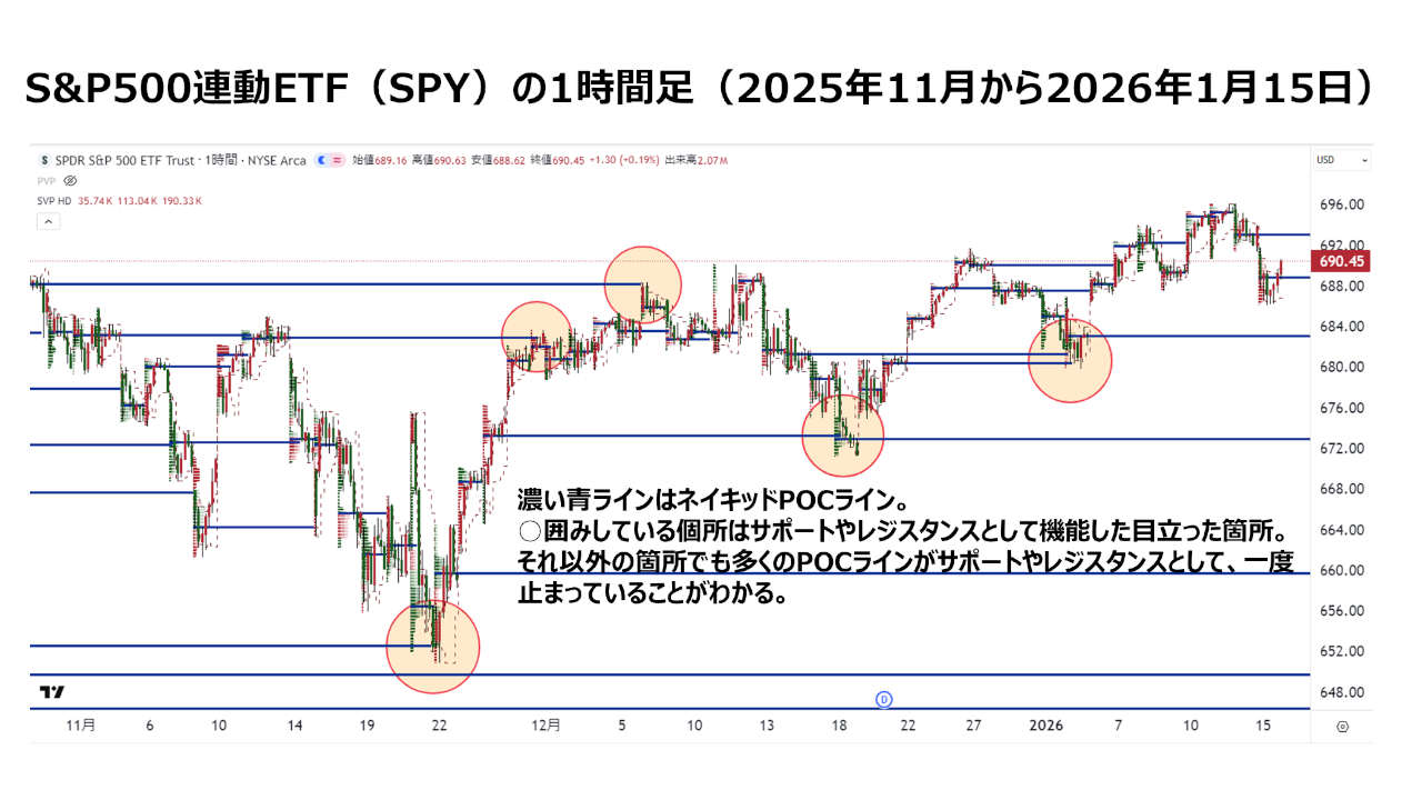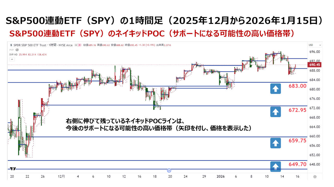 今後サポートとして意識されやすい価格帯の候補です。▼2025年11月から2026年1月にかけての SPY 1時間足チャート